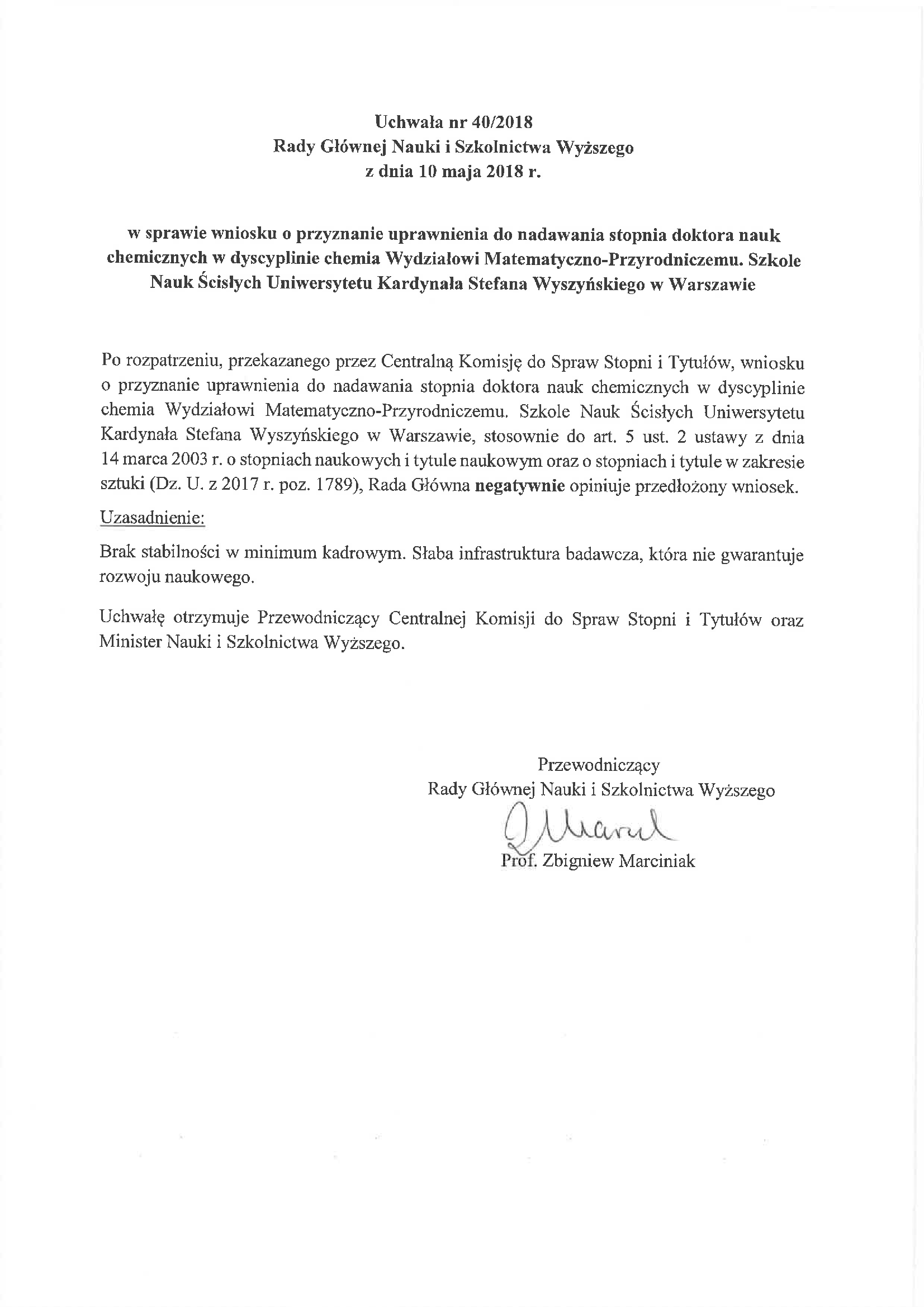 Uchwała nr 40/2018 Rady Głównej Nauki i Szkolnictwa Wyższego z dnia 10 maja 2018 r. w sprawie wniosku o przyznanie uprawnienia do nadawania stopnia doktora nauk chemicznych w dyscyplinie chemia Wydziałowi Matematyczno-Przyrodniczemu. Szkole Nauk Ścisłych Uniwersytetu Kardynała Stefana Wyszyńskiego w Warszawie