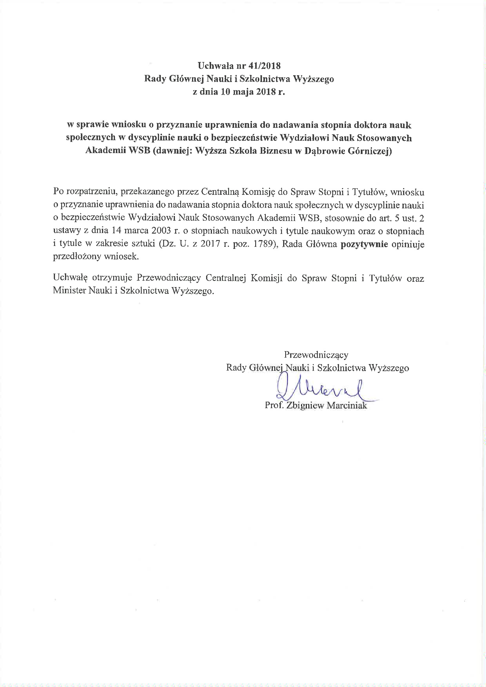 Uchwała nr 41/2018 Rady Głównej Nauki i Szkolnictwa Wyższego z dnia 10 maja 2018 r. w sprawie wniosku o przyznanie uprawnienia do nadawania stopnia doktora nauk społecznych w dyscyplinie nauki o bezpieczeństwie Wydziałowi Nauk Stosowanych Akademii WSB (dawniej: Wyższa Szkoła Biznesu w Dąbrowie Górniczej)