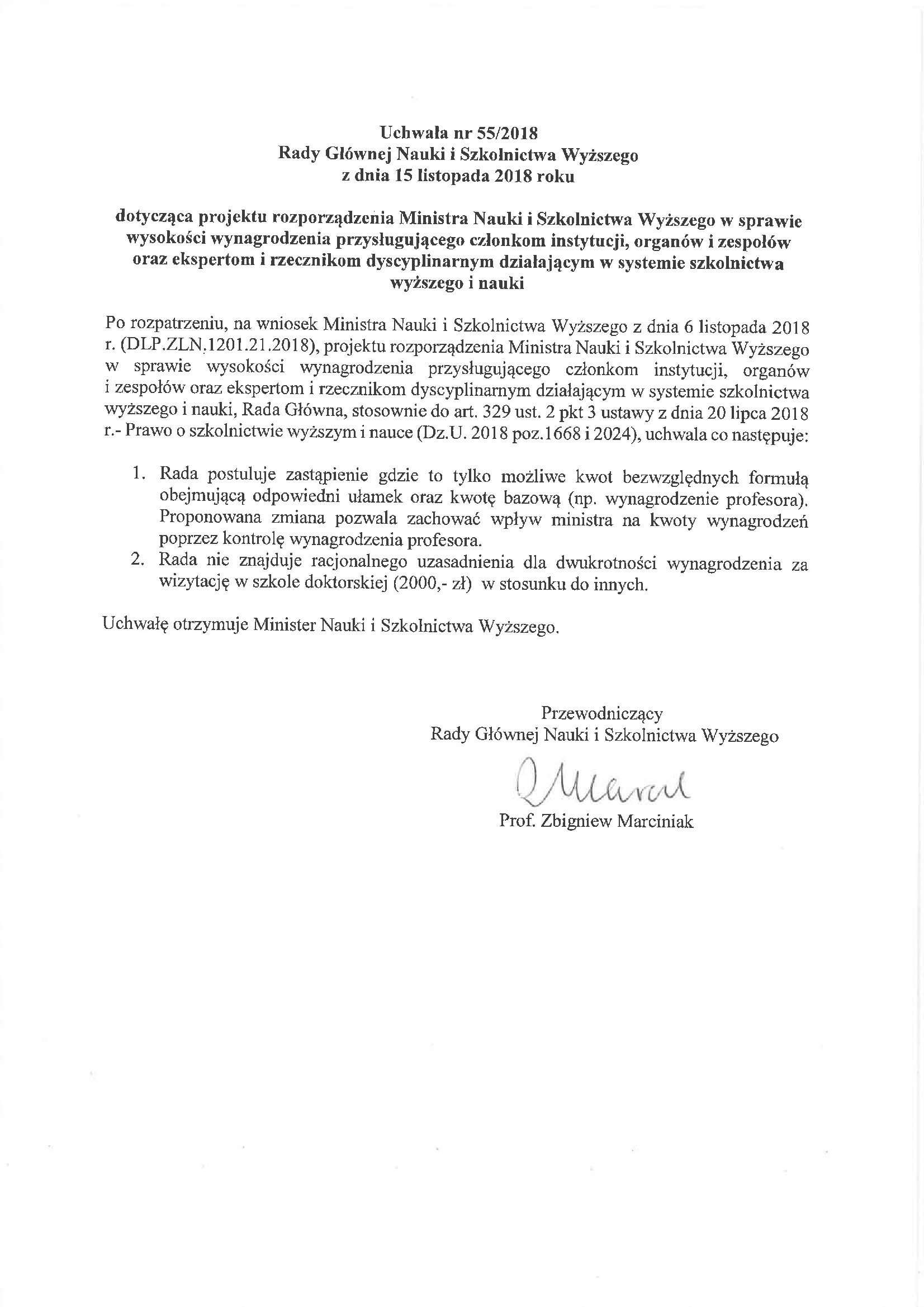 Uchwała nr 55/2018 Rady Głównej Nauki i Szkolnictwa Wyższego z dnia 15 listopada 2018 roku dotycząca projektu rozporządzenia Ministra Nauki i Szkolnictwa Wyższego w sprawie wysokości wynagrodzenia przysługującego członkom instytucji, organów i zespołów oraz ekspertom i rzecznikom dyscyplinarnym działającym w systemie szkolnictwa wyższego i nauki