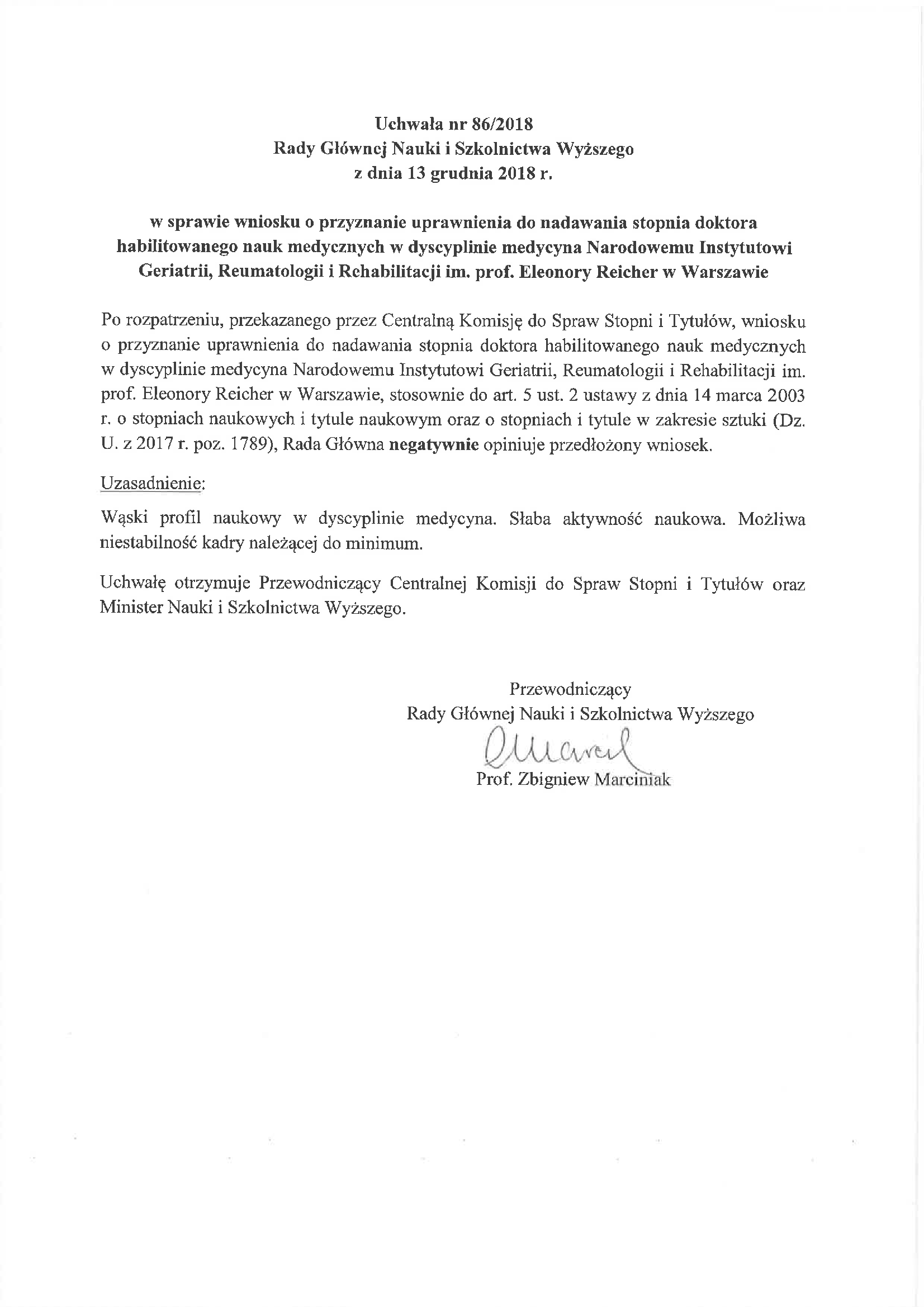 Uchwała nr 86/2018 Rady Głównej Nauki i Szkolnictwa Wyższego z dnia 13 grudnia 2018 r. w sprawie wniosku o przyznanie uprawnienia do nadawania stopnia doktora habilitowanego nauk medycznych w dyscyplinie medycyna Narodowemu Instytutowi Geriatrii, Reumatologii i Rehabilitacji im. prof. Eleonory Reicher w Warszawie