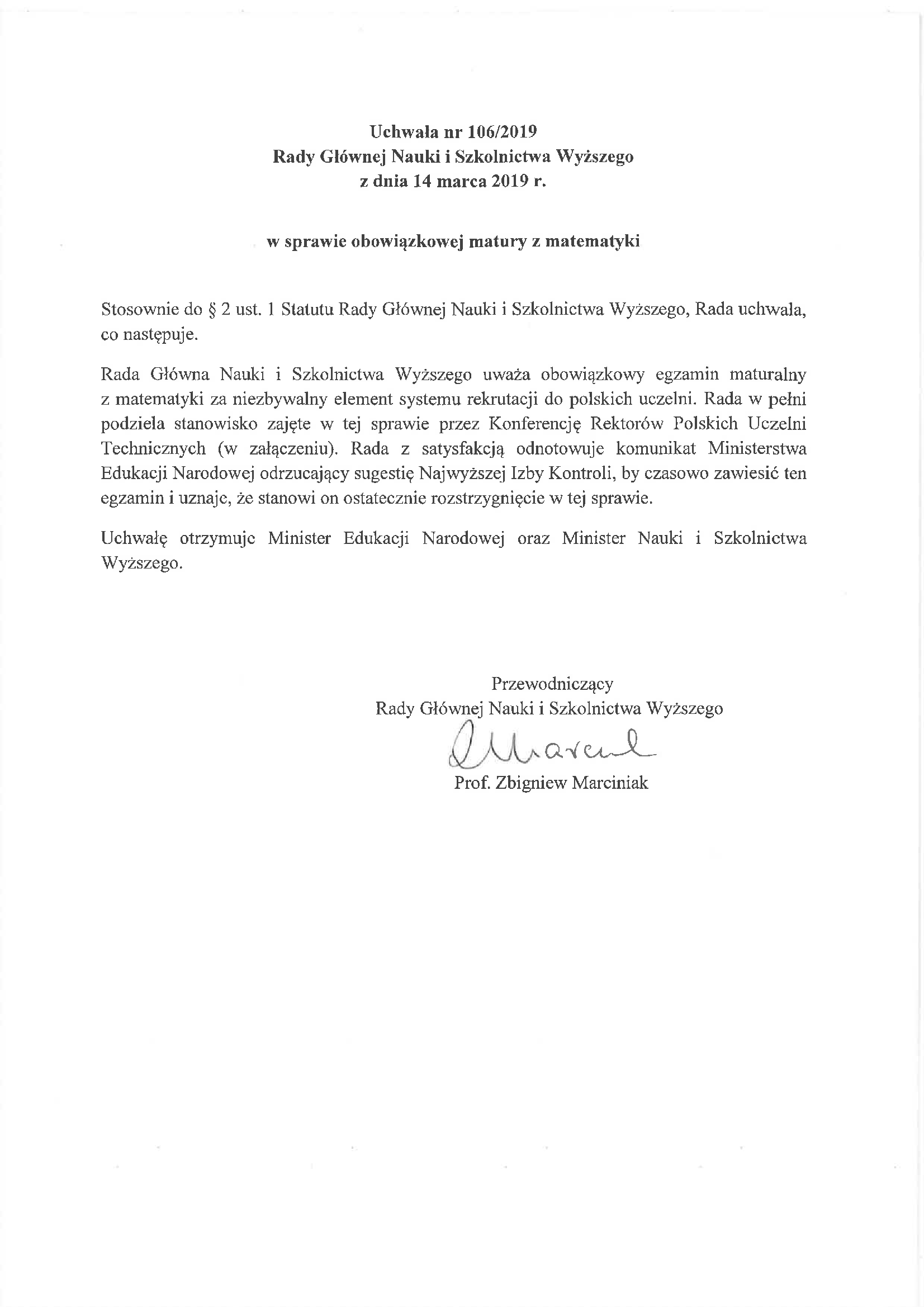 Uchwała nr 106/2019 Rady Głównej Nauki i Szkolnictwa Wyższego z dnia 14 marca 2019 r. w sprawie obowiązkowej matury z matematyki