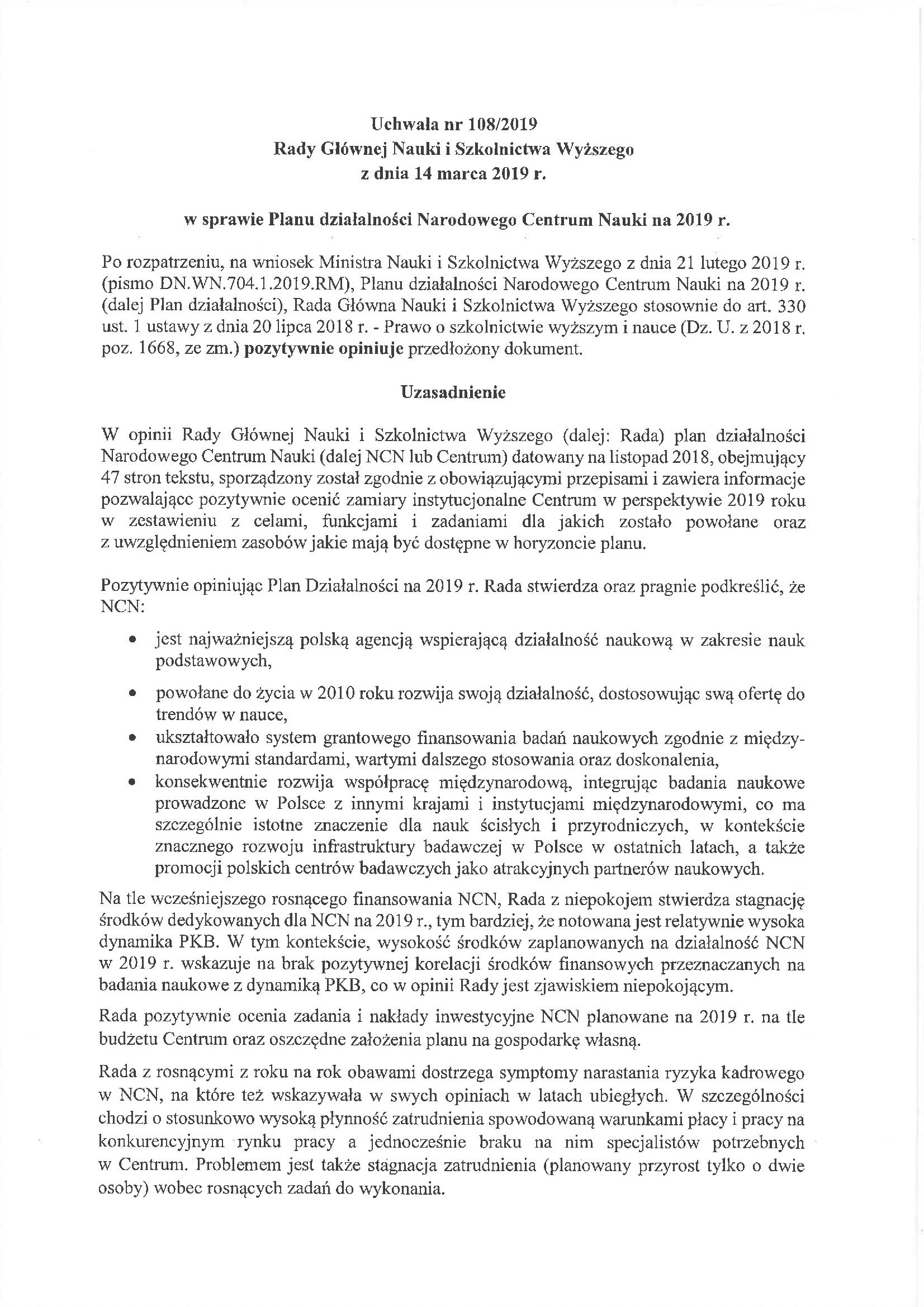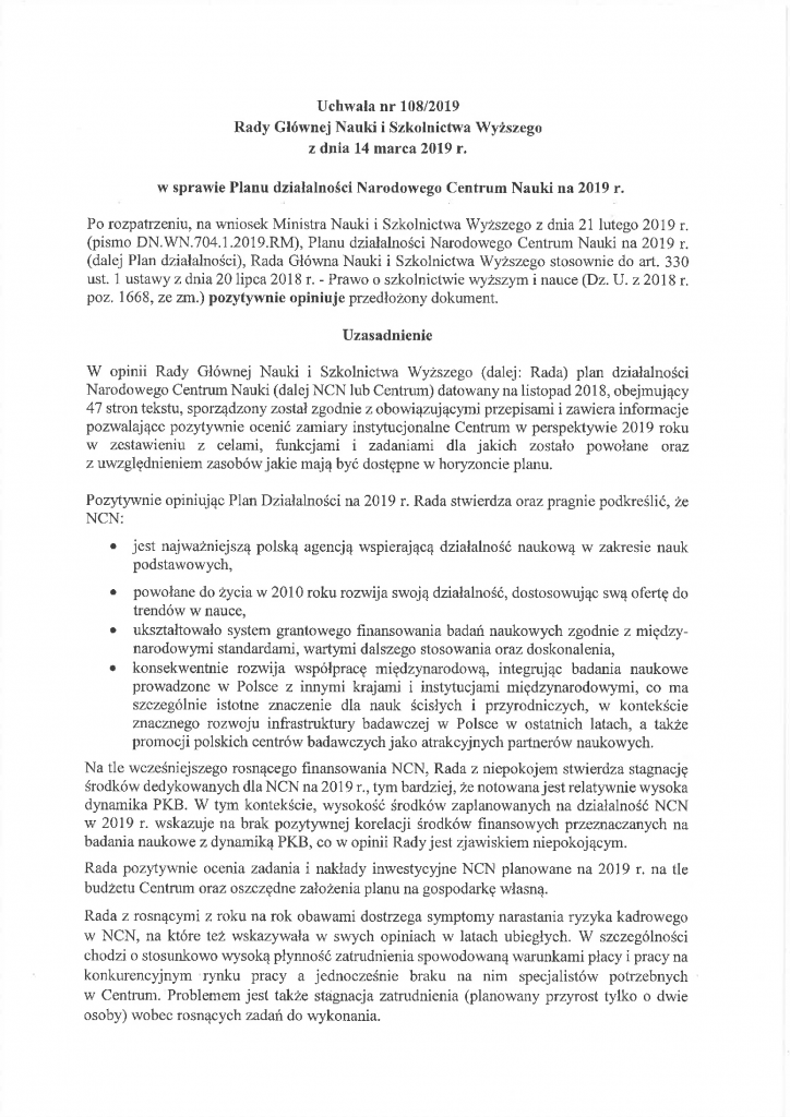 Uchwała nr 108/2019 Rady Głównej Nauki i Szkolnictwa Wyższego z dnia 14 marca 2019 r. w sprawie Planu działalności Narodowego Centrum Nauki na 2019 r.