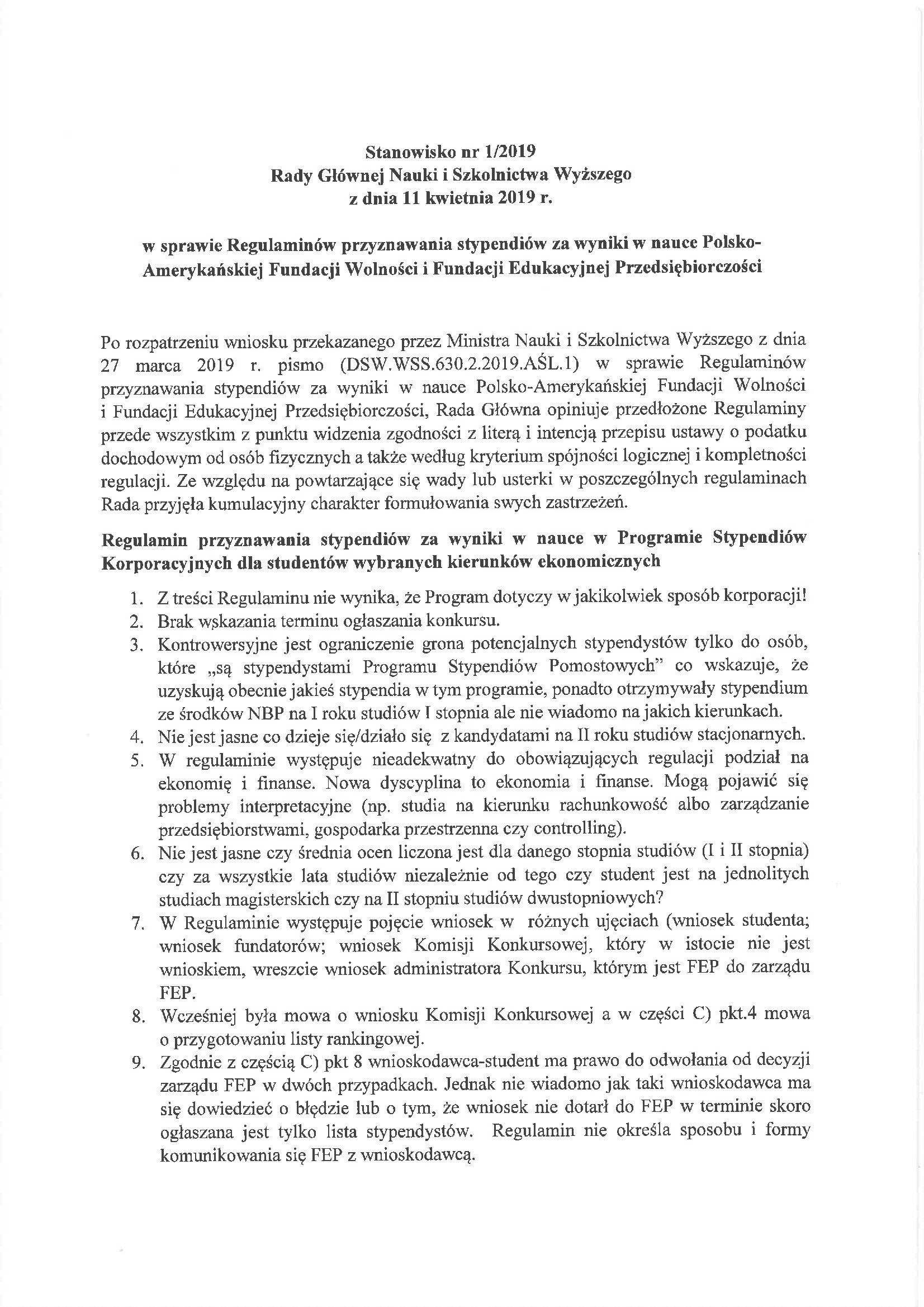 Stanowisko nr 1/2019 Rady Głównej Nauki i Szkolnictwa Wyższego z dnia 11 kwietnia 2019 r. w sprawie Regulaminów przyznawania stypendiów za wyniki w nauce Polsko-Amerykańskiej Fundacji Wolności i Fundacji Edukacyjnej Przedsiębiorczości
