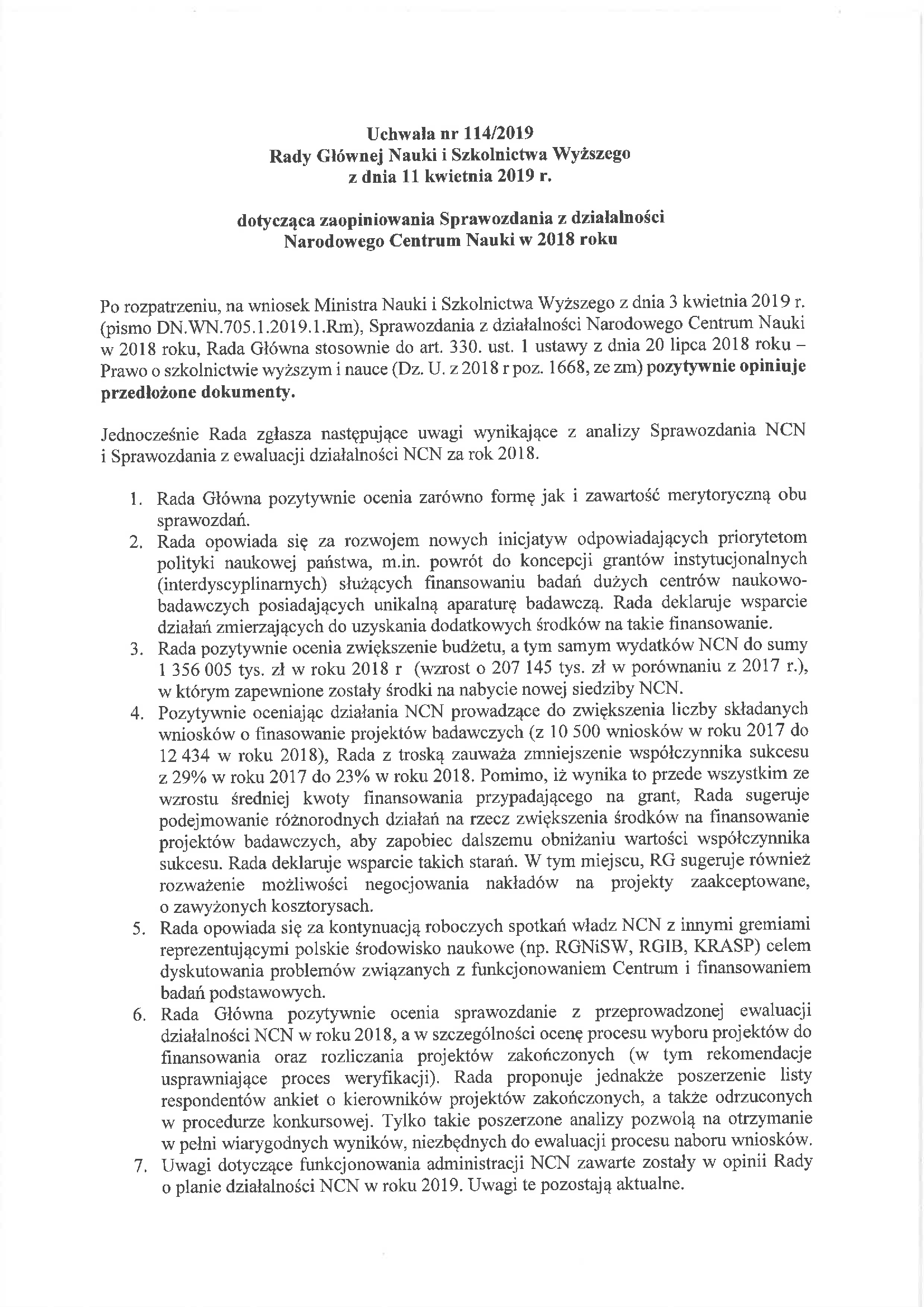 Uchwała nr 114/2019 Rady Głównej Nauki i Szkolnictwa Wyższego z dnia 11 kwietnia 2019 r. dotycząca zaopiniowania Sprawozdania z działalności Narodowego Centrum Nauki w 2018 roku