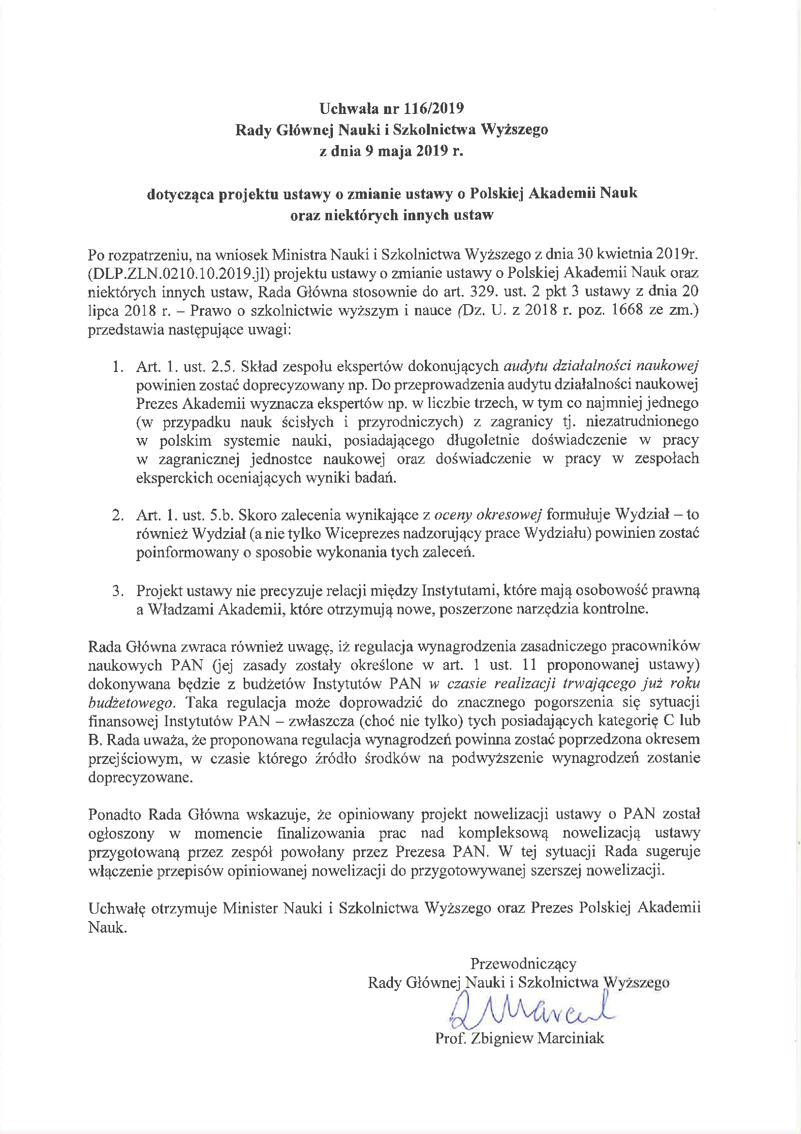 Uchwała nr 116/2019 Rady Głównej Nauki i Szkolnictwa Wyższego z dnia 9 maja 2019 r. dotycząca projektu ustawy o zmianie ustawy o Polskiej Akademii Nauk oraz niektórych innych ustaw