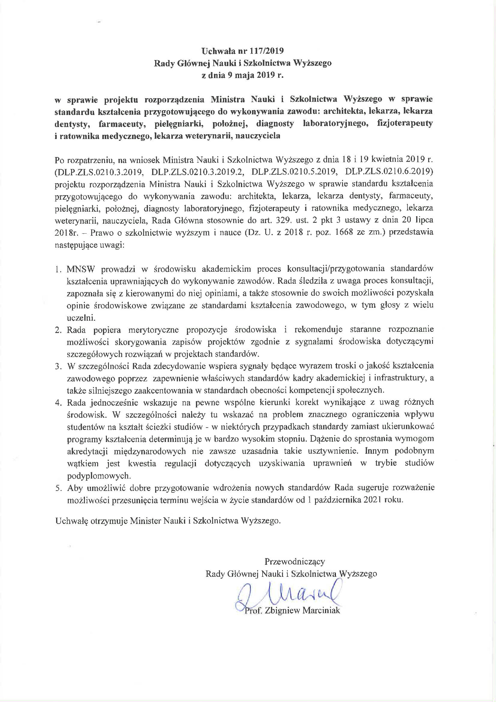 Uchwała nr 117/2019 Rady Głównej Nauki i Szkolnictwa Wyższego z dnia 9 maja 2019 r. w sprawie projektu rozporządzenia Ministra Nauki i Szkolnictwa Wyższego w sprawie standardu kształcenia przygotowującego do wykonywania zawodu: architekta, lekarza, lekarza dentysty, farmaceuty, pielęgniarki, położnej, diagnosty laboratoryjnego, fizjoterapeuty i ratownika medycznego, lekarza weterynarii, nauczyciela