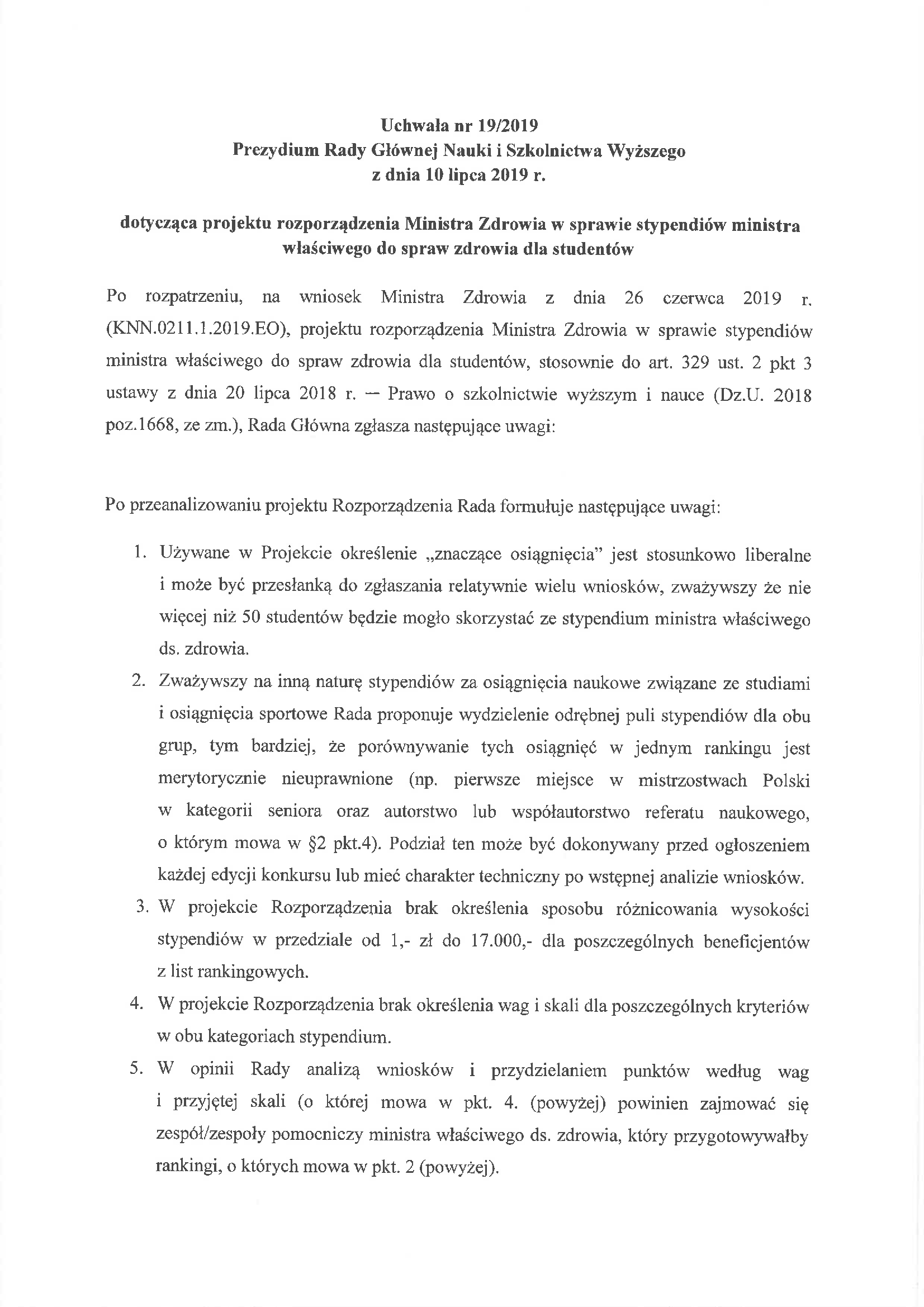 Uchwała nr 19/2019 Prezydium Rady Głównej Nauki i Szkolnictwa Wyższego z dnia 10 lipca 2019 r. dotycząca projektu rozporządzenia Ministra Zdrowia w sprawie stypendiów ministra właściwego do spraw zdrowia dla studentów