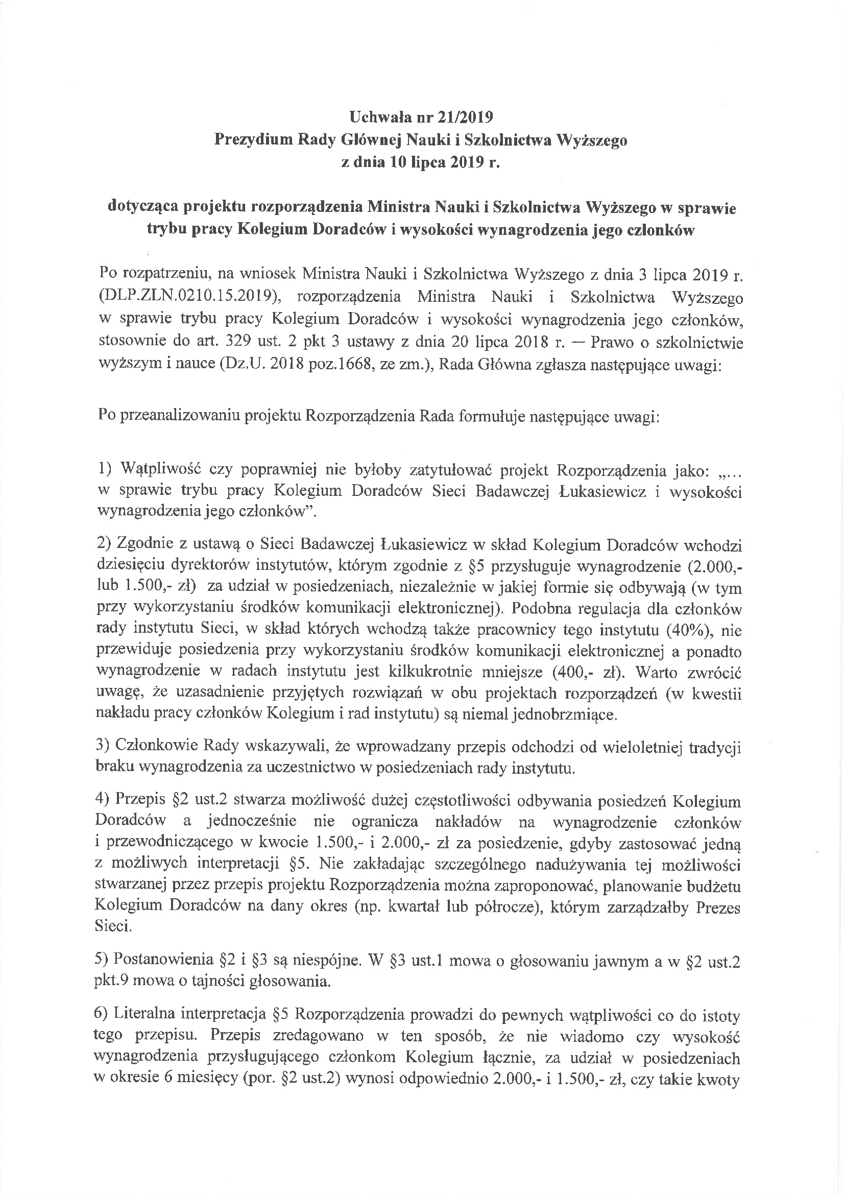 Uchwała nr 21/2019 Prezydium Rady Głównej Nauki i Szkolnictwa Wyższego z dnia 10 lipca 2019 r. dotycząca projektu rozporządzenia Ministra Nauki i Szkolnictwa Wyższego w sprawie trybu pracy Kolegium Doradców i wysokości wynagrodzenia jego członków