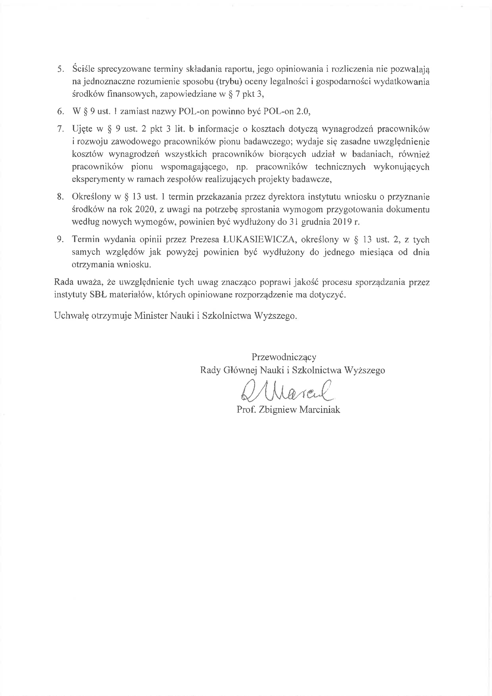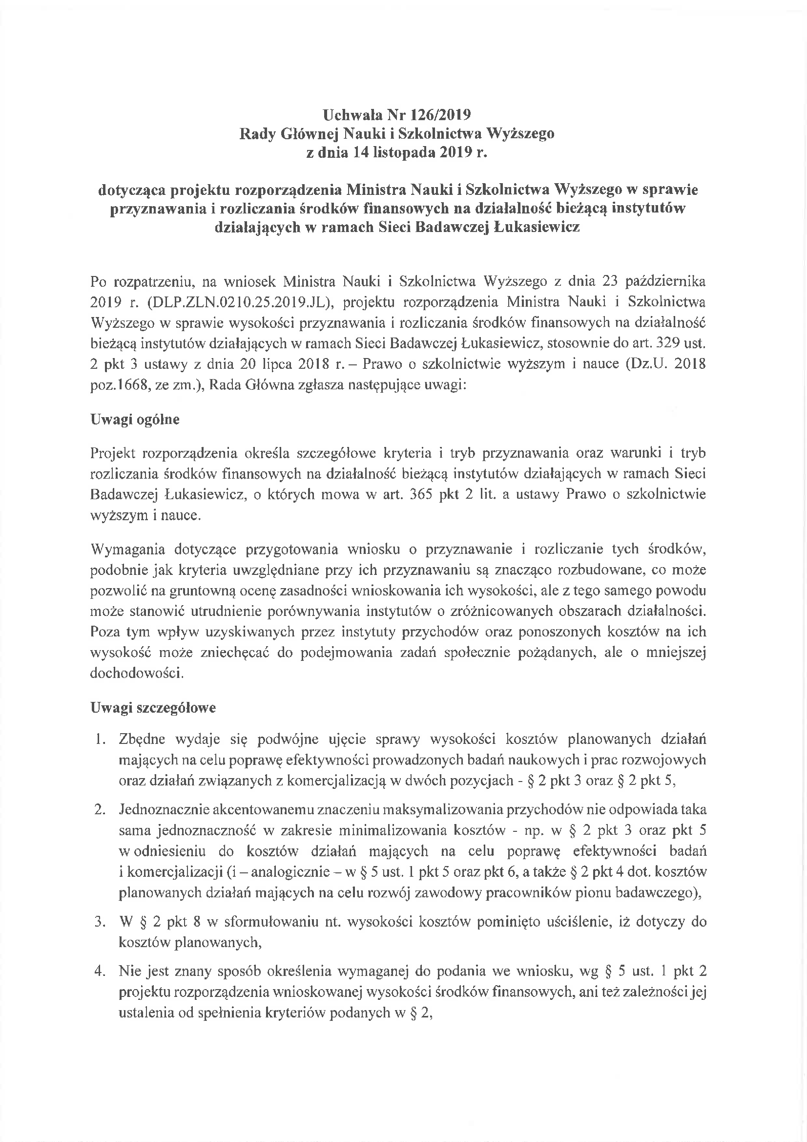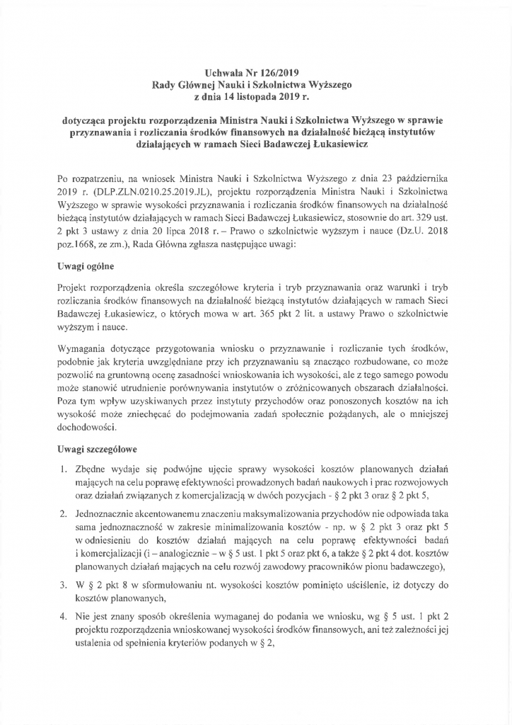 Uchwała Nr 126/2019 Rady Głównej Nauki i Szkolnictwa Wyższego z dnia 14 listopada 2019 r. dotycząca projektu rozporządzenia Ministra Nauki i Szkolnictwa Wyższego w sprawie przyznawania i rozliczania środków finansowych na działalność bieżącą instytutów działających w ramach Sieci Badawczej Łukasiewicz