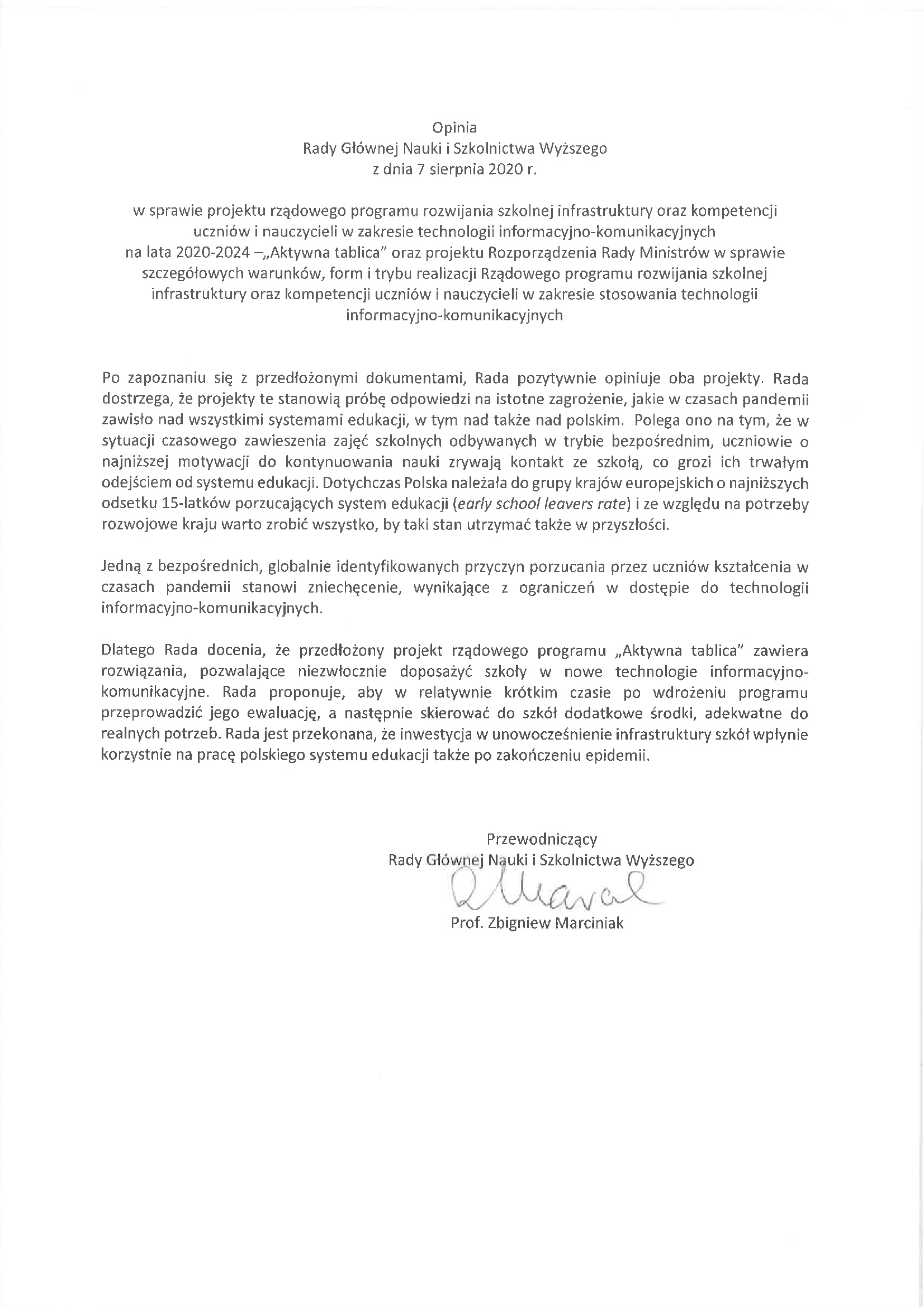 Opinia Rady Głównej Nauki i Szkolnictwa Wyższego z dnia 7 sierpnia 2020 r. w sprawie projektu rządowego programu rozwijania szkolnej infrastruktury oraz kompetencji uczniów i nauczycieli w zakresie technologii informacyjno-komunikacyjnych na lata 2020-2024 – „Aktywna tablica” oraz projektu Rozporządzenia Rady Ministrów w sprawie szczegółowych warunków, form i trybu realizacji Rządowego programu rozwijania szkolnej infrastruktury oraz kompetencji uczniów i nauczycieli w zakresie stosowania technologii informacyjno-komunikacyjnych