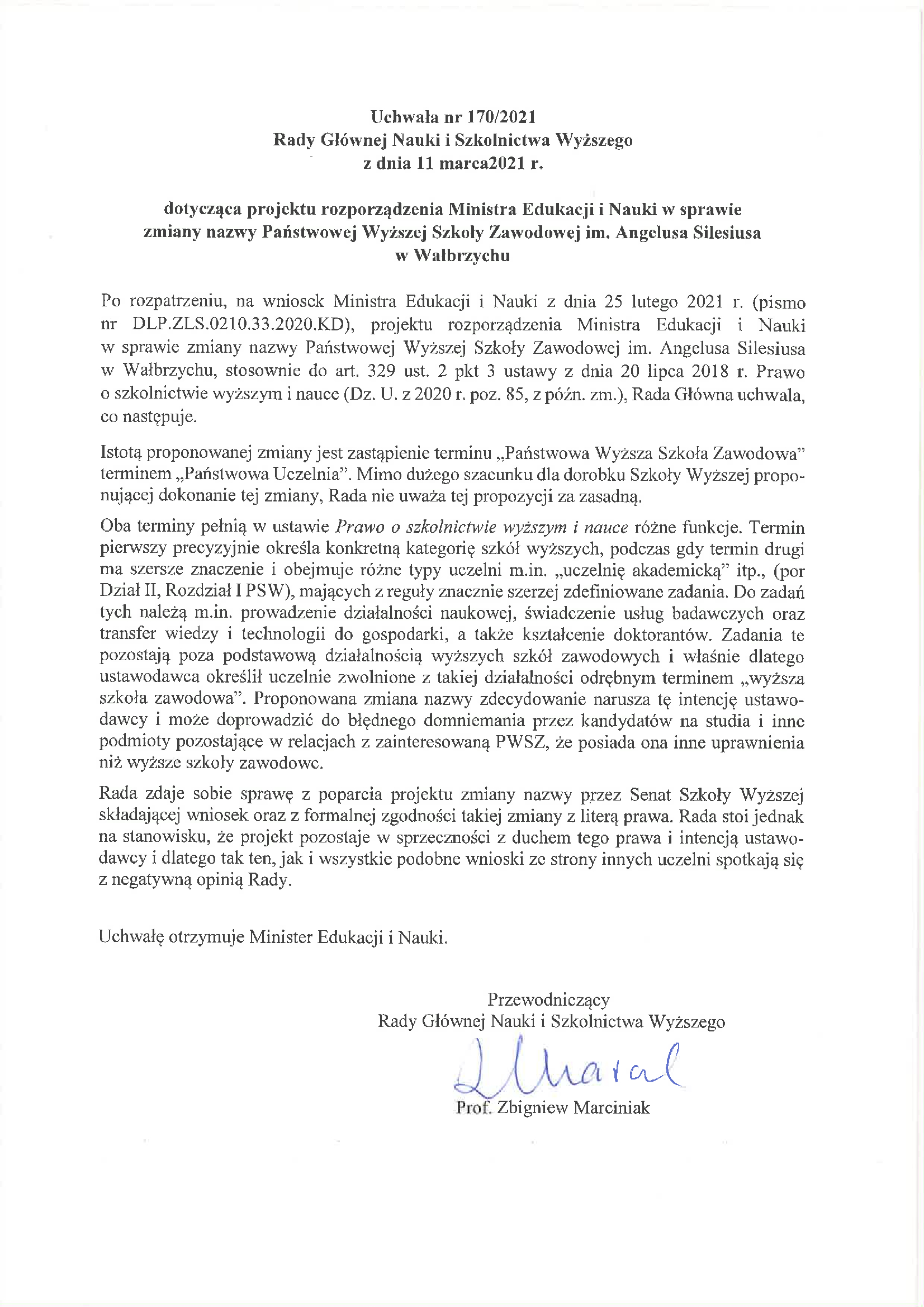 Uchwała nr 170/2021 Rady Głównej Nauki i Szkolnictwa Wyższego z dnia 11 marca 2021 r. dotycząca projektu rozporządzenia Ministra Edukacji i Nauki w sprawie zmiany nazwy Państwowej Wyższej Szkoły Zawodowej im. Angelusa Silesiusa w Wałbrzychu